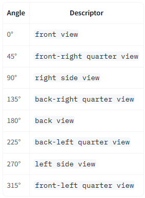 [azimuth] [elevation] [distance] - Start with LoRA strength 0.9 - Adjust based on results