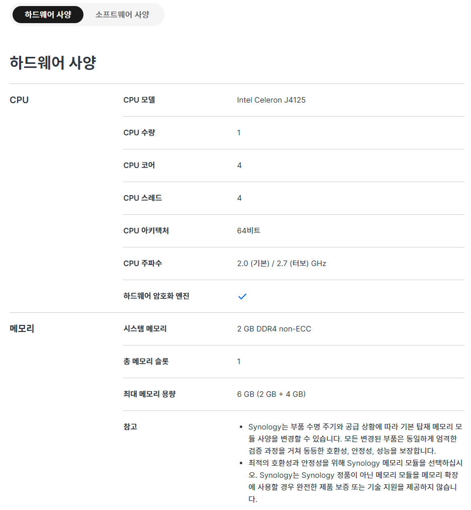 현재 집에서 사용하는 NAS인 시놀로지 DS225+의 사양입니다.