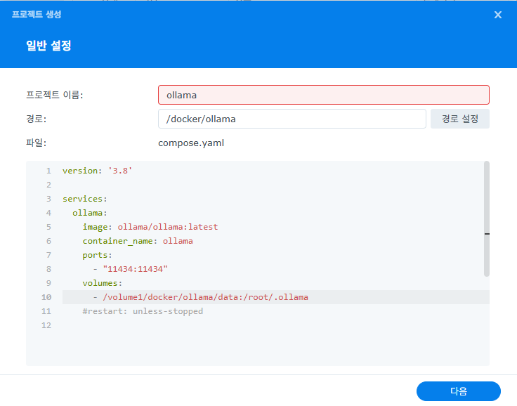 docker/ollama폴더를 생성해/root/.ollama경로와 연결합니다. (모델 데이터를 저장하는 곳입니다.)