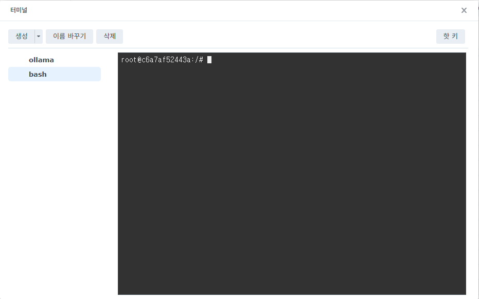 ollama컨테이너를 더블 클릭합니다. - [터미널] -> [생성] -> [bash]를 차례로 클릭합니다.