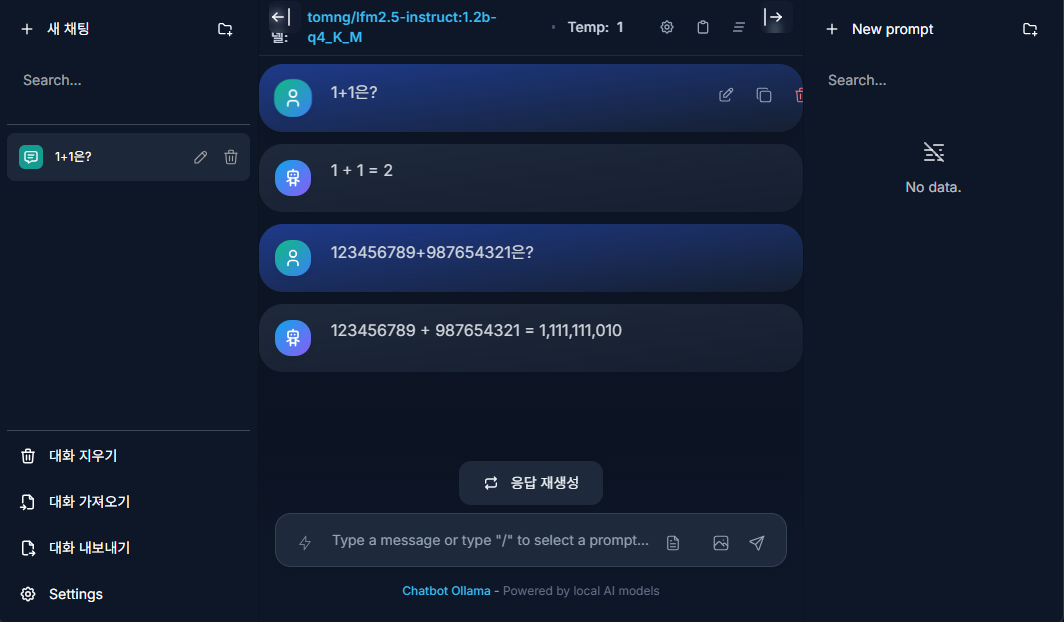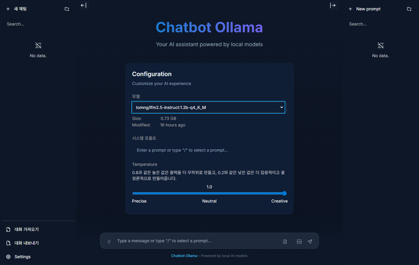 메인화면에서 ollama에서 다운로드한 lfm 모델 리스트와 시스템 프롬프트, Temparature 같은 간단한 설정화면이 나타납니다.